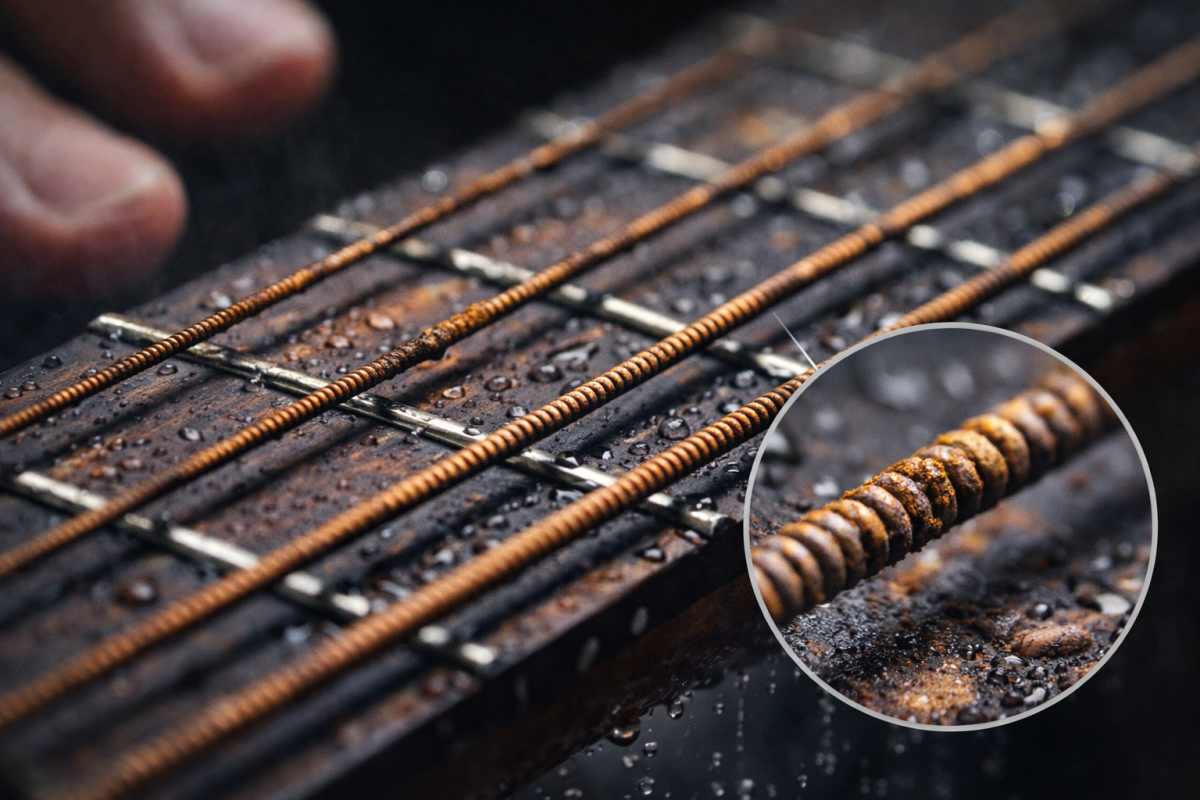 پس اگر بخواهیم دقیق جواب بدهیم چرا سیم گیتار زنگ میزند، باید بگوییم: به دلیل ترکیب فلز، رطوبت و تماس مداوم با هوا و تعریق دست.